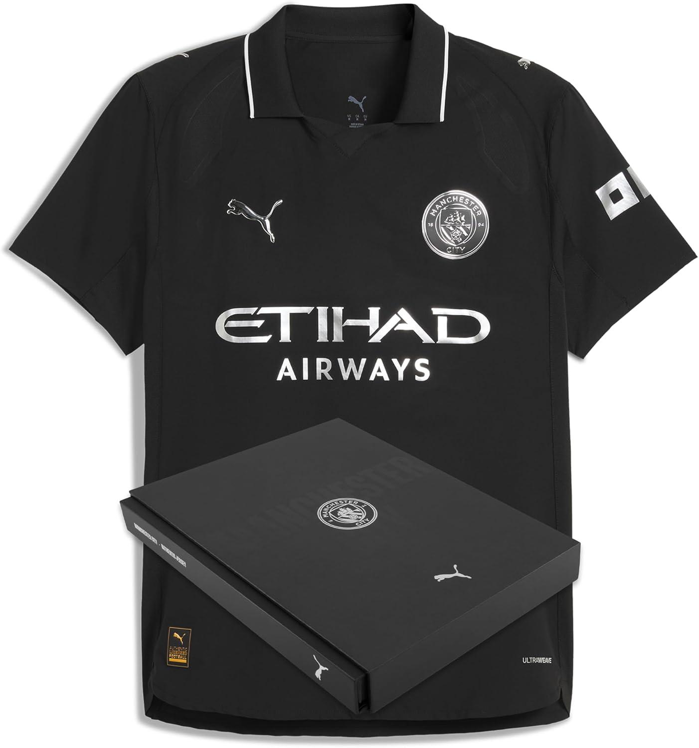 Celebrate heritage and innovation with the Manchester City Authentic Away Jersey 2025/26. Inspired by Manchester City’s origins in Gorton, the 25/26 Away Kit reimagines the club’s first-known kit from 1884 with a bold all-black design and metallic detailing that brings the past into the present. A tribute to the first Cityzens, this kit marks the beginning of a new chapter—timeless, powerful and rooted in history. Built for performance, this slim-fit jersey features lightweight ULTRAWEAVE fabric and dryCELL sweat-wicking technology to keep you cool and comfortable. Mesh panels on the shoulders, sides, and underarms enhance breathability, while laser-cut detailing on the chest adds a premium finish. Finished with the Manchester City crest, PUMA Cat logos, and an Authentic Licensed Product label featuring a heat-transfer 3D weld mirage effect, this jersey is a must-have for all dedicated Cityzens. Comes in a premium gift box, beautifully wrapped in tissue paper to make the unboxing moment special.