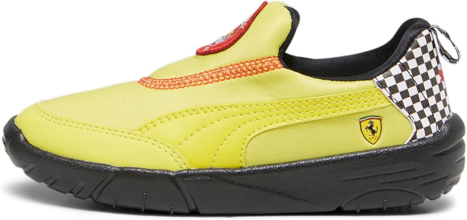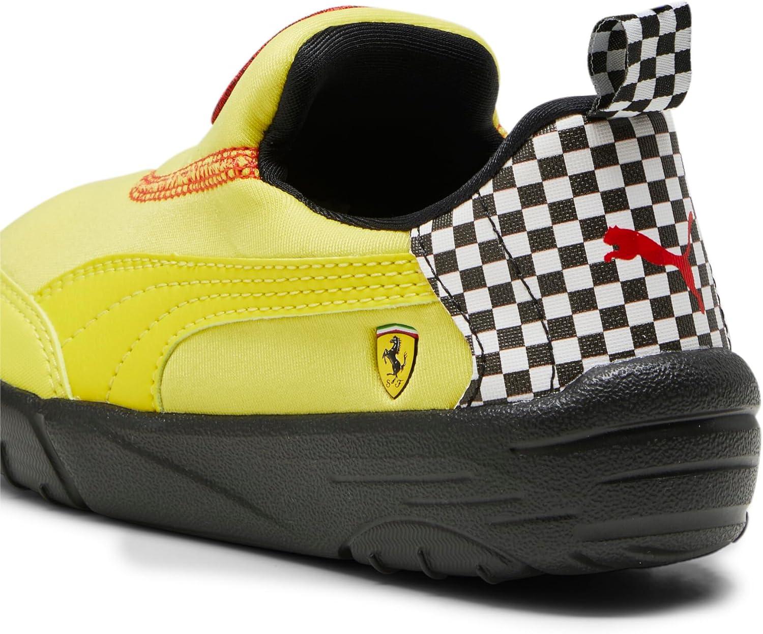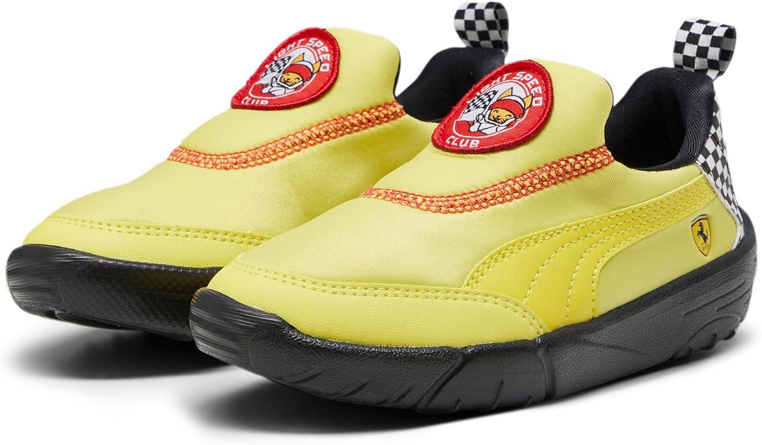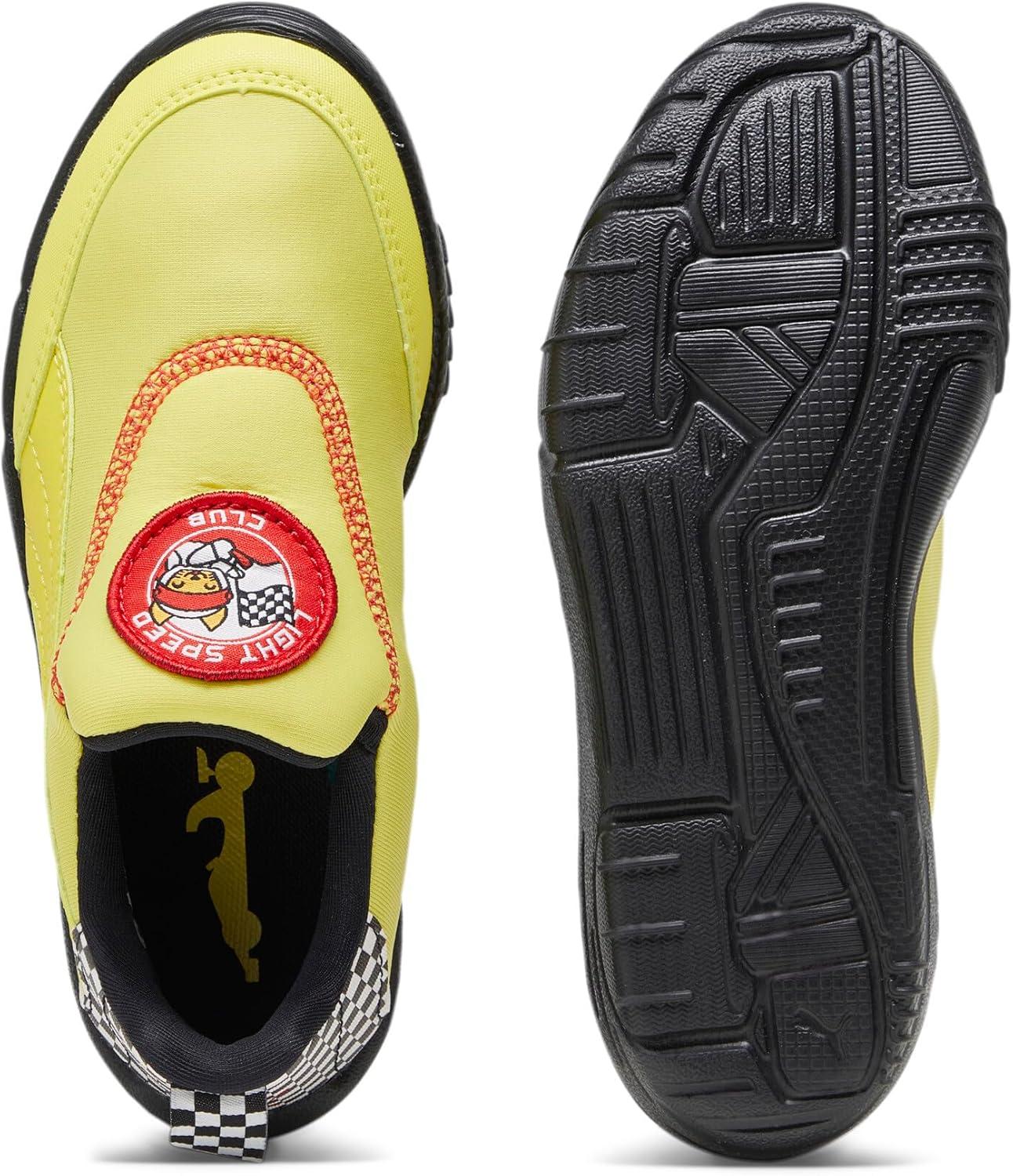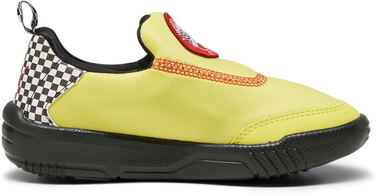 Designed to enhance traction and reassure comfort for our little fans out here with an EVA tooling. Our very own slip-on motorsport silhouette brings together all relevant elements from car and the track into one design: including a tooling inspired by a car and graphics of the brand's Mini Cat boosting the playfulness and fun features on the shoe.