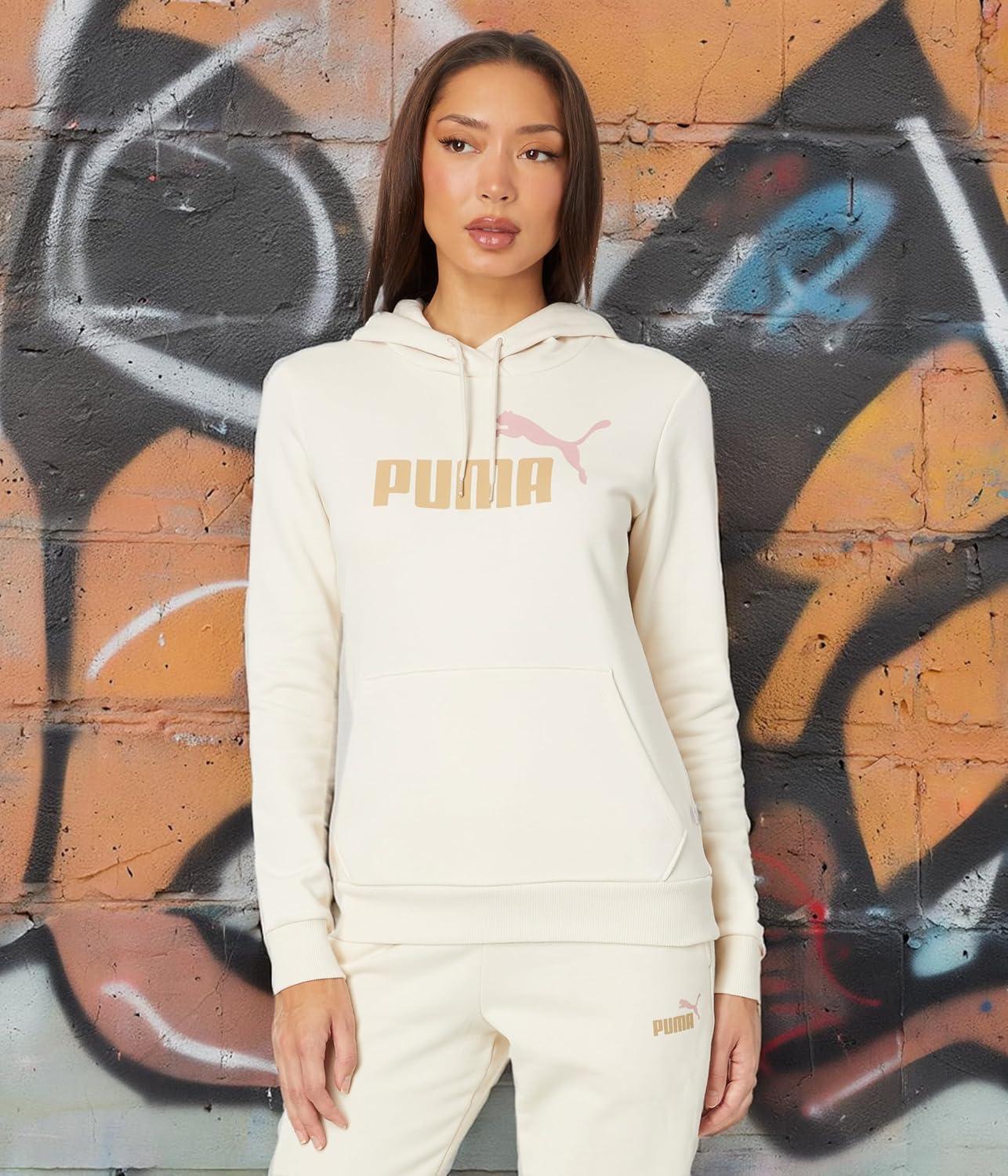 Elevate your everyday style with the PUMA Women’s Essentials Logo Fleece Hoodie, a perfect blend of comfort and fashion. This women's hoodie is crafted from a soft blend of 66% cotton and 34% recycled polyester, providing a plush feel that wraps you in warmth without being too heavy. Ideal for any occasion, whether running errands, hitting the gym, or simply relaxing at home, this fleece hoodie for women ensures you stay cozy and confident all day long. The fully adjustable hood with drawcords helps to block out the chill, while the ribbed cuffs and hem maintain a secure fit and trap heat efficiently. Designed with practicality in mind, the kangaroo pocket brings functional style, offering a handy spot for your essentials or a warm refuge for your hands. Showcasing bold PUMA branding on the chest, this hoodie stands out with its laid-back yet stylish flair. Available in regular and plus sizes, it offers a versatile regular fit allowing ample room to move. Built with high-quality construction and featuring at least 20% recycled materials, this essential piece not only exudes style but also supports sustainable fashion. Make the PUMA women's hoodie your go-to for a touch of casual elegance, knowing that it reflects your chic and eco-conscious choices.